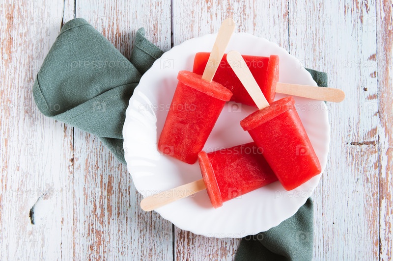 Закройте эскизы арбузов на деревянных палочках на тарелке в поле зрения сверху стола