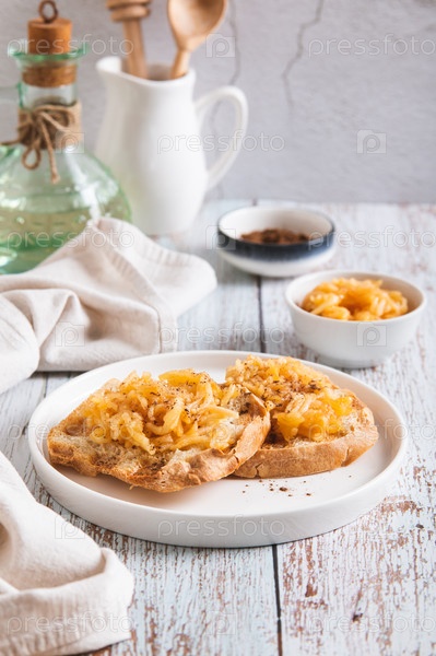 Апетит корута с тушеными яблочными полосками на тарелке на столе вертикальный вид