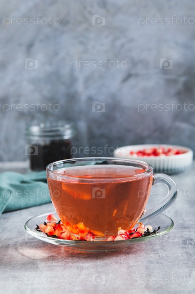 Детоксикационный зеленый чай из граната в чашке на столе вертикальный вид