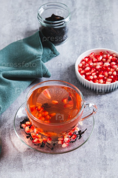 Травяной зеленый инфузионный чай из граната в чашке на столе вертикальный вид