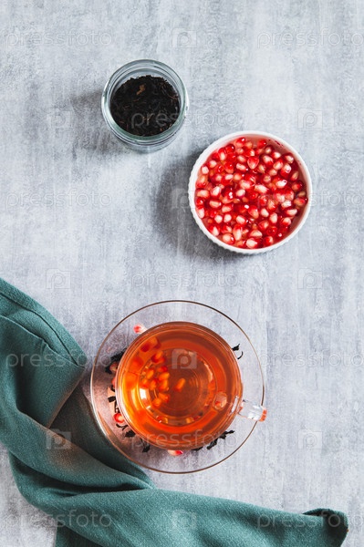 Травяной зеленый инфузионный чай из граната в чашке на столе и вертикальный вид