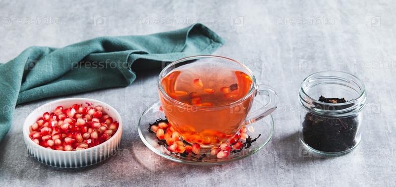 Детоксикационный зеленый чай из граната в чашке на столе WEB баннер