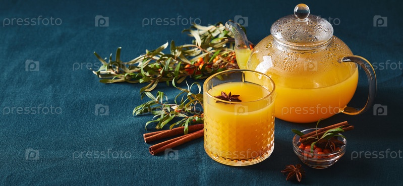 Стеклянный чайник и стакан чая морского терна с палочками корицы и звездным анисом на синем фоне