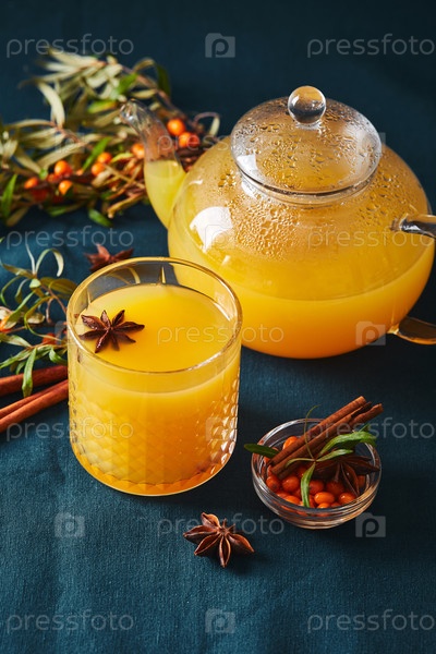 Стеклянный чайник и стакан чая морского терна с палочками корицы и звездным анисом на синем фоне
