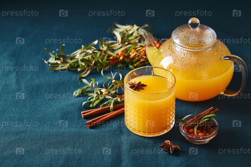 Стеклянный чайник и стакан чая морского терна с палочками корицы и звездным анисом на синем фоне