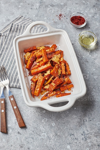 сладкие картофели с сыром в миске на сером фоне