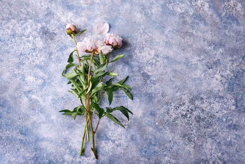 Розовые цветы пионни, ветви, листья и лепестки на синем фоне.Плоский лёд, вид сверху