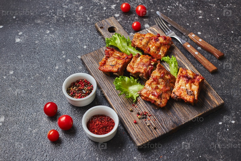 Нагретые выпеченные свиные ребра с пряностями и овощами на деревянной доске для резки на темном фоне