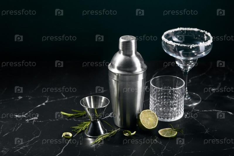 Шейкер для коктейлей, бокалы и ингредиенты на тёмном мраморном фоне