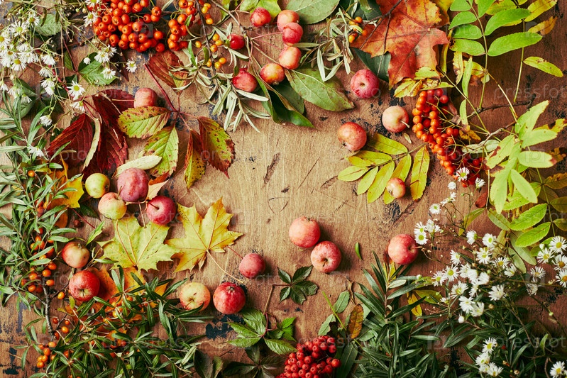 Красные гребежные ягоды, маленькие яблоки, морской тернов, ветви дикого винограда, листья кленовых и осенние белые полевые цветы.Осенний фон, урожай натюрморта на деревянной доске