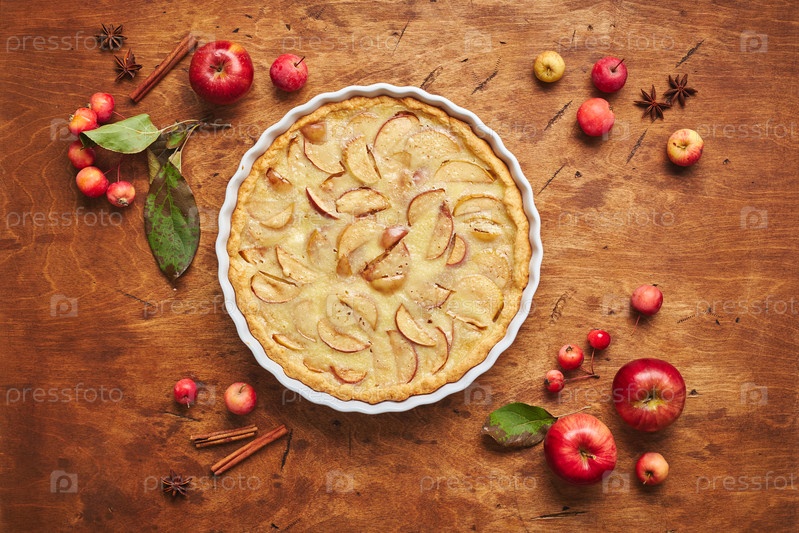 Домашний яблочный торт с кислой смесью, красными яблоками, крабом и корицей на деревянном фоне, вид сверху