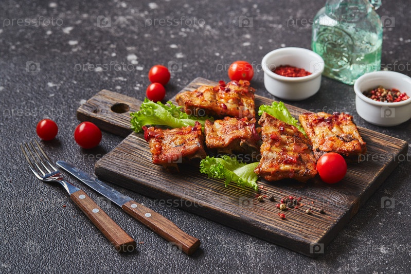 Нагретые выпеченные свиные ребра с пряностями и овощами на деревянной доске для резки на темном фоне