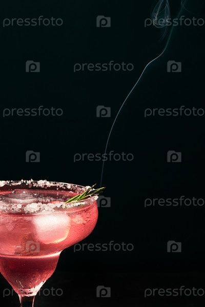 Коктейль алкогольного или безалкогольного типа маргариты с льдом и поднимающейся ветвью розмарина на темном фоне