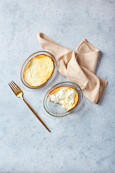 Вкусная кастрюля из коттеджного сыра в порционированных стеклянных формах с сметаной.Традиционная русская кухня на завтрак