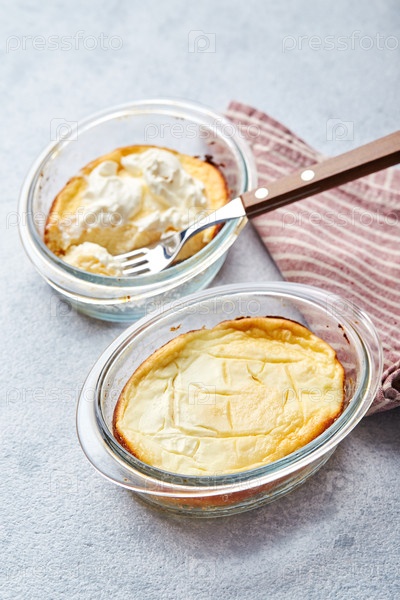 Вкусная кастрюля из коттеджного сыра в порционированных стеклянных формах с сметаной.Традиционная русская кухня на завтрак
