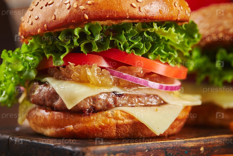 Апетитный домашний бургер с говядиной, сыром и мармеладным луком в ближайшем плане