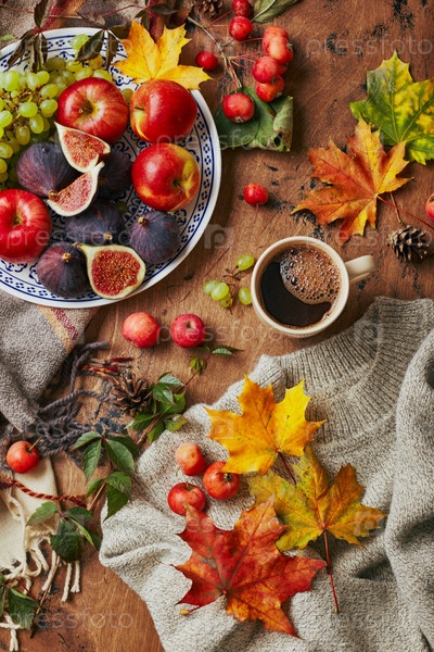 Блюда с инжирами, яблоками и виноградом и чашка кофе на деревянном фоне с теплым свиттером, шарфом, осенними листьями и яблоками