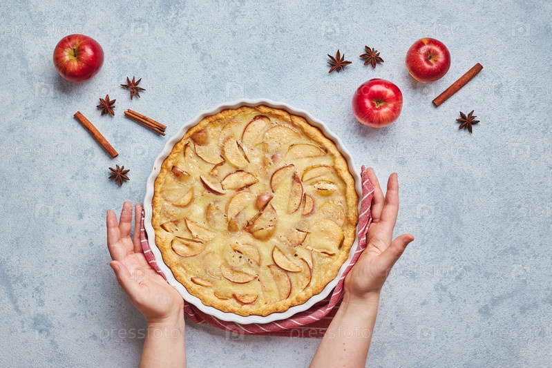 Женские руки и домашний яблочный пирог с сметаной на светлом фоне, вид сверху