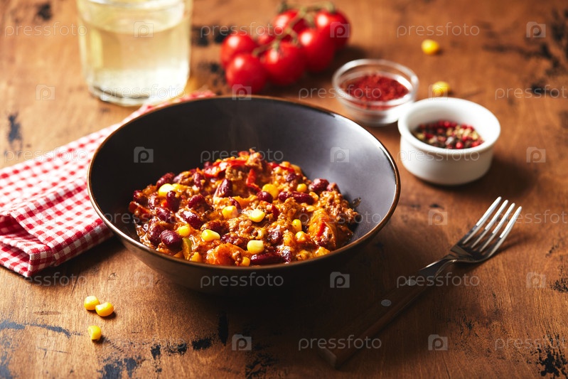 Chili Con Carne с говядиной, бобами и кукурузой в темной таре на деревянном фоне. мексиканская и техасская кухня