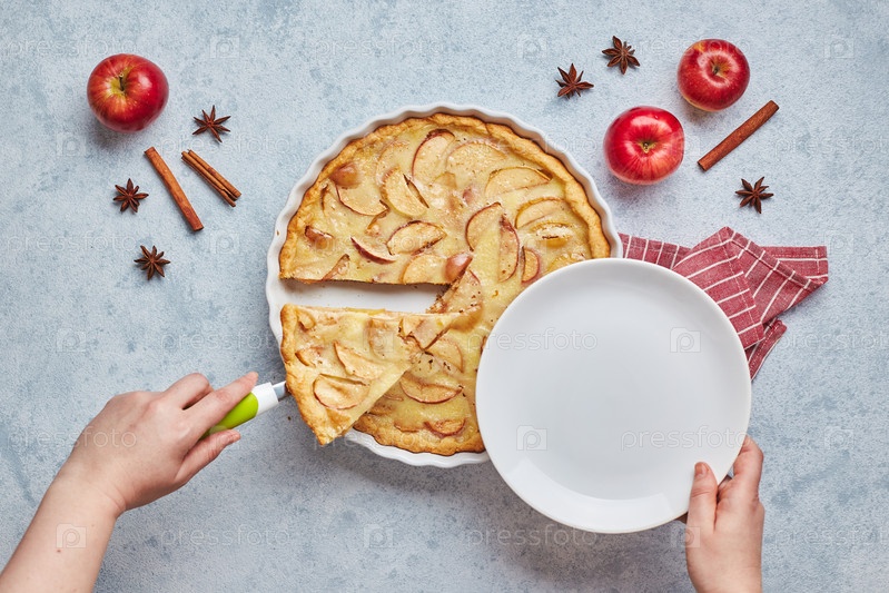 Женщина берет кусок домашнего яблочного пирога с сметаной на светлом фоне, вид сверху