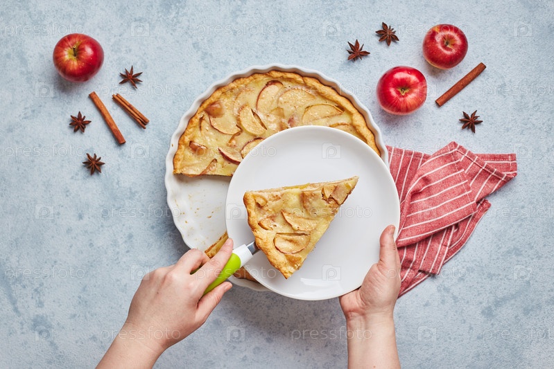 Женщина берет кусок домашнего яблочного пирога с сметаной на светлом фоне, вид сверху