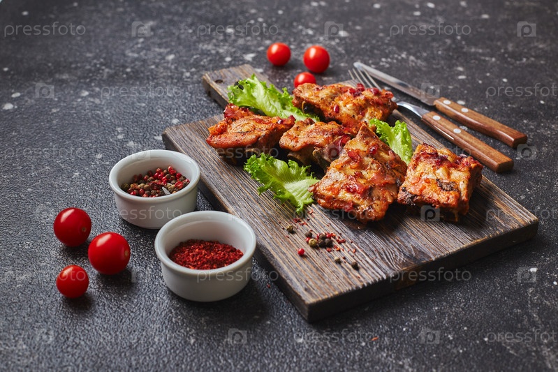 Нагретые выпеченные свиные ребра с пряностями и овощами на деревянной доске для резки на темном фоне