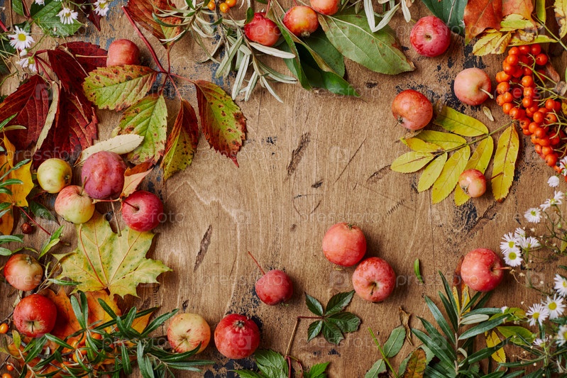 Красные гребежные ягоды, маленькие яблоки, морской тернов, ветви дикого винограда, листья кленовых и осенние белые полевые цветы.Осенний фон, урожай натюрморта на деревянной доске