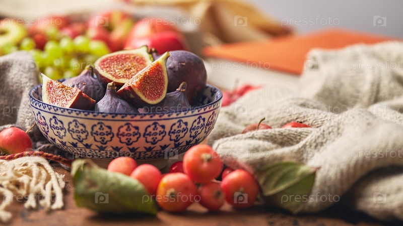 Блюда с инжирами, яблоками и виноградом на деревянном фоне с теплым уютным вязанием, осенними листьями и яблоками