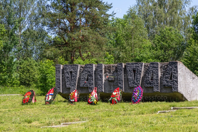 Вены у горизонтального монолита с датами обороны Ленинграда '1941-1944' мемориальный комплекс 'Лемболовская крепость' в солнечный день