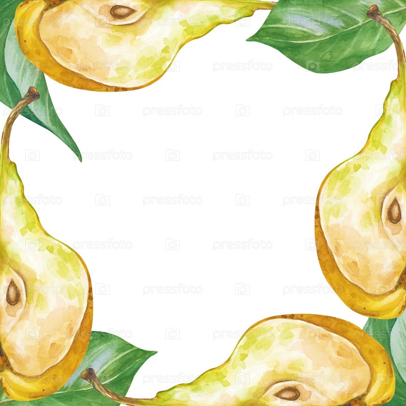 Квадратная рама из ручно нарисованных кусков спелой груши и зеленых листьев. Иллюстрация акварели на белом фоне. Ботанический шаблон, состоящий из нарезанного фрукта с пустым пространством для вставки