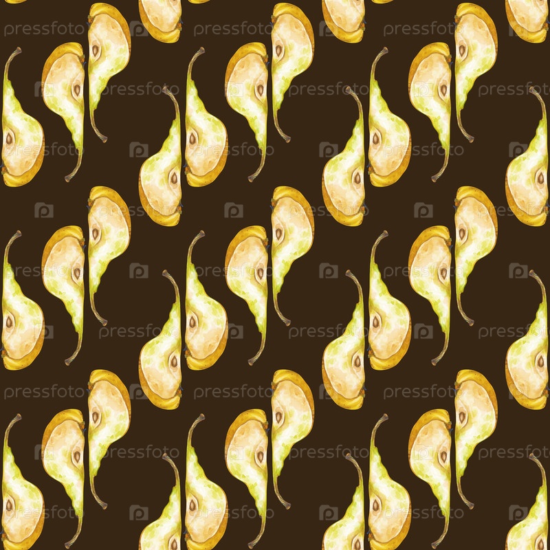 Бесшовный рисунок ручно нарисованных кусков спелой груши на темно-коричневом фоне. Иллюстрация акварели с фруктами. Ботанический шаблон для упаковки, обоев, посуды и текстиля
