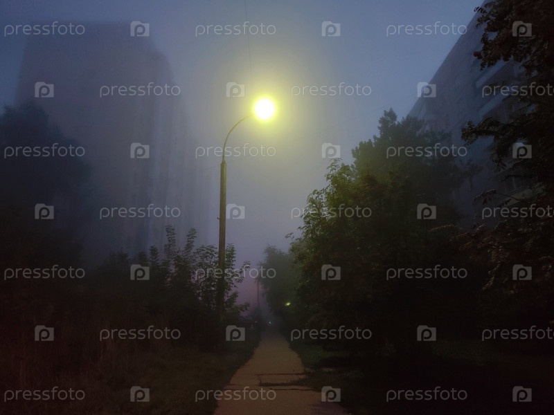 Уличный фонарь на фоне зданий в тумане