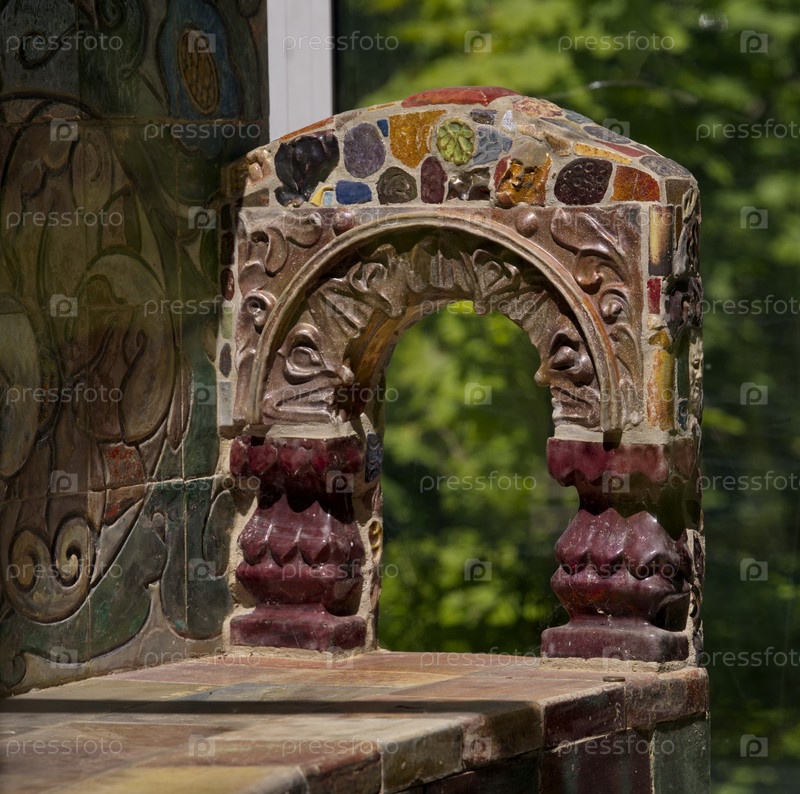 Абрамцево, Россия 9 июня 2022 года Фрагмент знаменитой мозаичной скамьи Врубеля в стиле майолики на территории музея-усадьбы под открытым небом