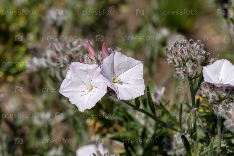 Вечнозеленый кустарник (Convolvulus cneorum) с белыми цветами, растущими вблизи