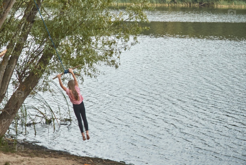 Девочка-подросток едет на велосипеде над бухтой Юрман.Россия