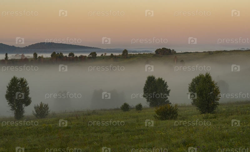 Юг Западной Сибири, Алтайский край. густой туман в низменностях холмистых степей с редкими деревьями на рассвете летнего дня