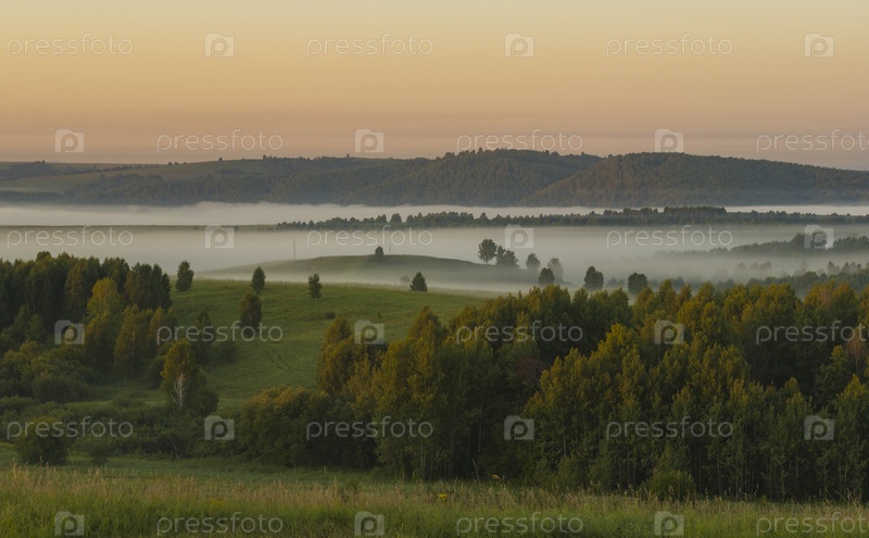 Юг Западной Сибири, Алтайский край. густой туман в низменностях холмистых степей с редкими деревьями на рассвете летнего дня