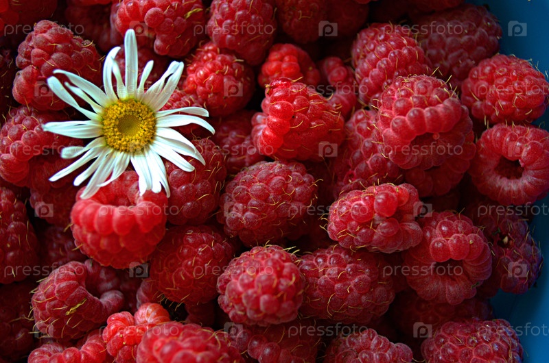 Урожай малины и цветок ромашки