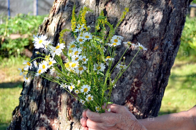 Букет полевых ромашек в руках пожилой женщины