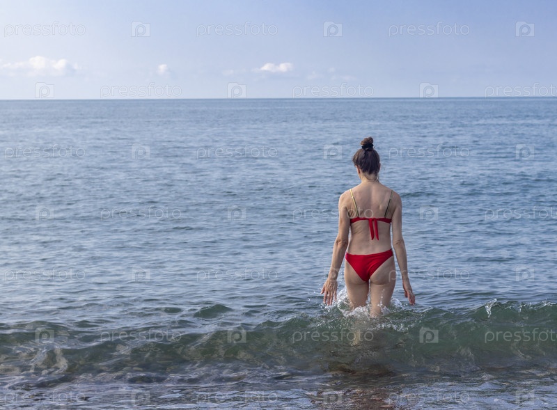 Привлекательная женщина с длинными волосами, одетая в красный бикини, выходит в море
