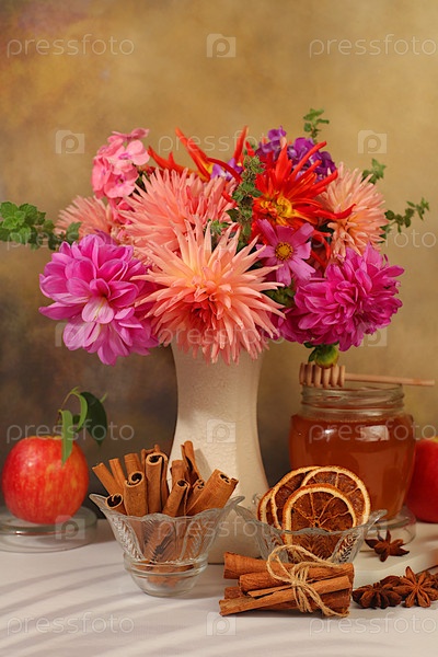 Осенний баннер с красивым букетом далия в вазе, мёд, яблоки, гранаты, корица и звездный анис на элегантном фоне, осенние приветствия и концепция благодарения