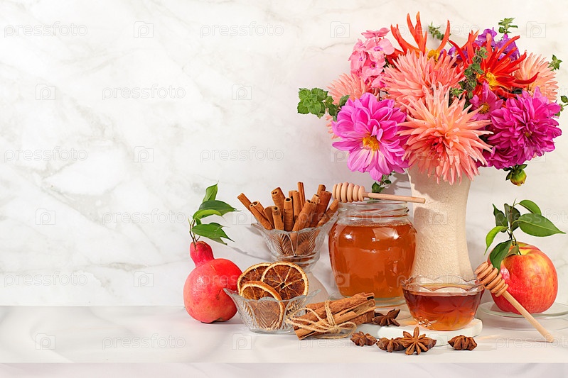 Осенний баннер с красивым букетом далия в вазе, мёд, яблоки, гранаты, корица и звездный анис на элегантном фоне, осенние приветствия и концепция благодарения