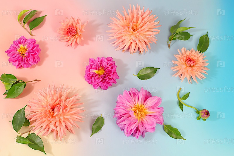 Солнечная открытка с красивыми цветами далии, абстрактная цветовая аранжировка и осенний натюрморт со сезонными цветами, фон и баннер для экрана, минималистическая концепция праздника