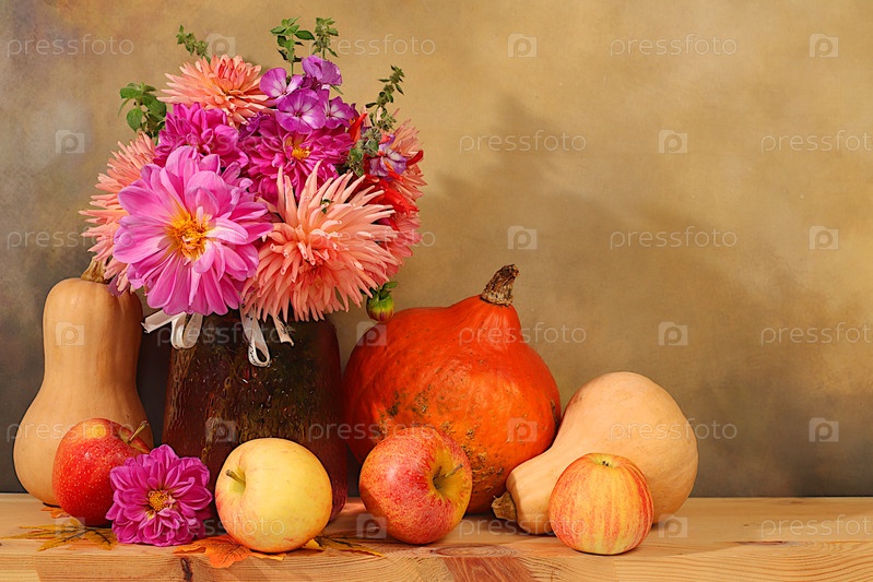 Осенние цветочные аранжировки с даллиями в вазе, абстрактные натюрморты с яблоками, тыквами и цветами, праздничный флаг Дня благодарения, осеннее приветствие