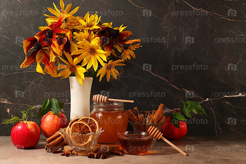 Осенние приветствия и концепция Дня благодарения, осенний баннер с красивым букетом рудбекии в вазе, мед, яблоки, гранаты, корица и звездный анис на темном фоне, и