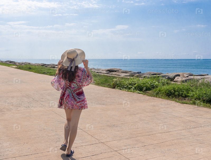Привлекательная женщина с длинными волосами, одетая в короткое красочное пляжное платье и соломенную шляпу, позирует для фотографии
