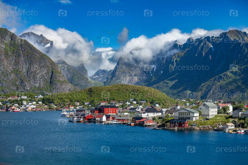 Удивительный озеленённый город на Рейнском или Лофотенских островах с голубым небом, округ Нордланд, Норвегия
