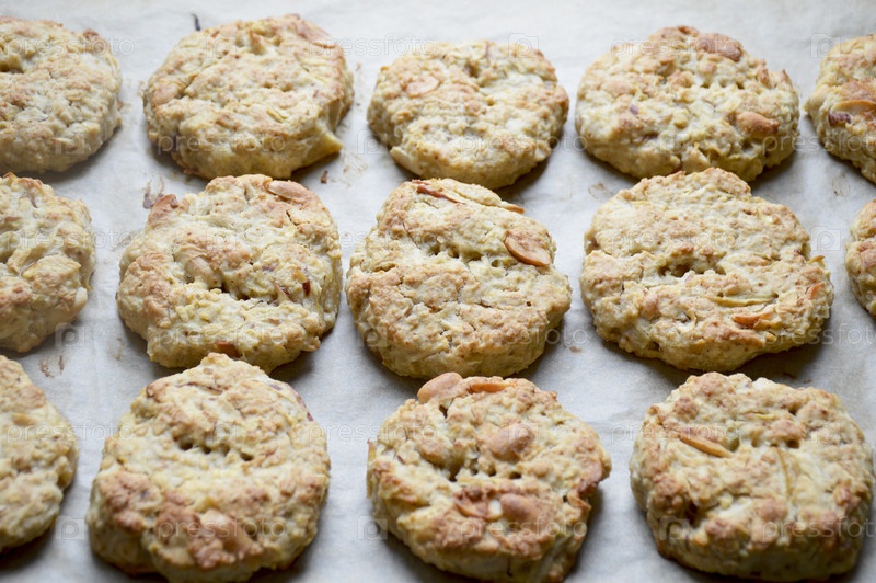 Готовые пирожные из овсяной муки лежат на листе пергаментного бумаги на хлебобулочном листке. Выпечьте дома. Вкусные печенье для завтрака для детей и взрослых. Десерт с молоком, чаем или кофе