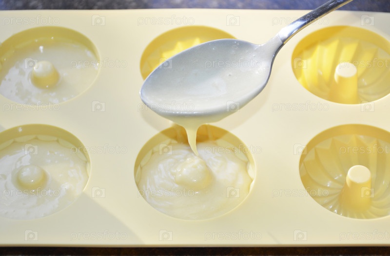 Налейте тесто для кексов или кексы в силиконовые выпечки