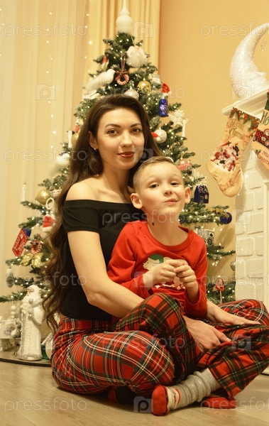 Мать и сын на фото у елки, празднуют Новый год или Рождество
